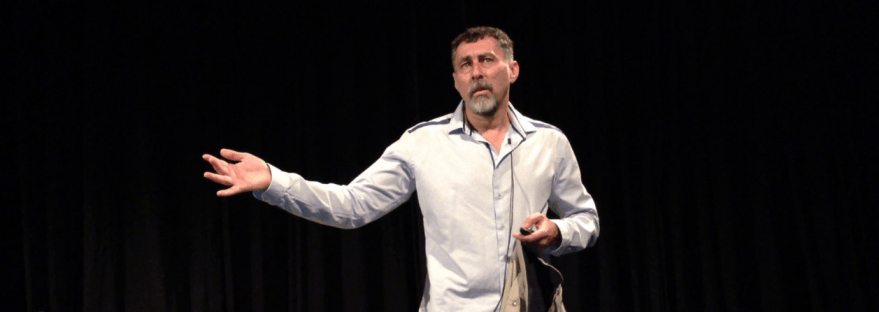 Raro. Lo describiría como raro. Podríamos decir original, pero creo que raro es más apropiado. Porque no es un monólogo típico de stand-up comedy (yo suelo decir que es stand-up tragedy), no es teatro propiamente dicho, no es una clase académica, no es ballet ni natación sincronizada. Lo que yo quería es que la palabra fuera la protagonista absoluta: no hay música, no hay casi efectos de luces, sólo hay una persona que habla y va pasando revista a los temas paradigmáticos de la poesía: el amor, el desamor, el sexo, la muerte. Y sí, algo de pedagogía intento hacer: trato de que el que escucha comprenda que la poesía es maravillosa, necesaria y sanadora. De hecho tengo un pizarrón y voy anotando cositas, pero los espectadores se pueden quedar tranquilos: no les voy a tomar examen.