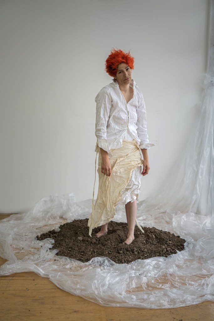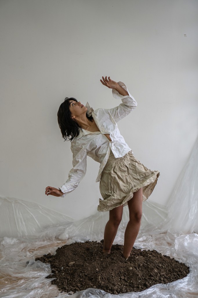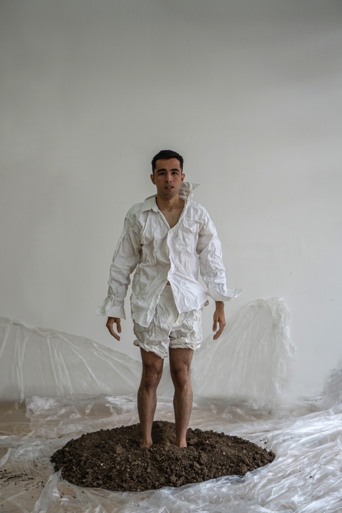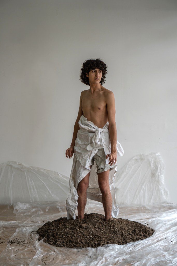 -Uriel Cistaro es el director de arte de la obra, y con él venimos trabajando hace años. En nuestra obra anterior, Yo duermo con la ropa del día, trabajamos el cuerpo de las capas en el vestuario. De la edad encimada, de la piel cargada como gesto barroco en la tela, todo lo que se acumula y se recuerda en el cuerpo llevarlo a un pliegue. Me interesa mucho lo sucio, lo roto, el mundo o sufrimiento de lo que “no encaja” y en este sentido el vestuario tiene que ser el dolor apretado del cuerpo que no encajó. Como gesto previo a la palabra. Para la escenografía, nos fue elemental pensar en la tierra como materia, sentimos que le otorga una sensación primaria al despliegue del cuerpo en escena. Volver a la tierra, volver al pie desnudo, hay mucho de reencontrarse con el cuerpo, darse la oportunidad de volver a verse, aprender a verse. Escenograficamente pensamos un hogar en el centro, sin techo, una silla y tierra, un centro firme donde el cuerpo pueda hablar, decir, comunicar, sentir. Meter los pies en la tierra y tener el amparo del hogar caliente en la espalda para sentir el alivio de decir eso que duele, lo áspero, lo que ya no se quiere para la vida. Volver a tocarse el pecho para saberse presente o ausente.